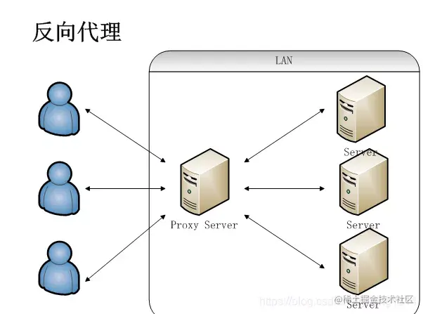 反向代理:客户端无法感知代理,因为客户端访问网络不需要配置,只要把请求发送到反向代理服务器,由反向代理服务器去选择目标服务器获取数据,然后再返回到客户端,此时反向代理服务器和目标服务器对外就是一个服务器,暴露的是代理服务器地址,隐藏了真实服务器IP地址