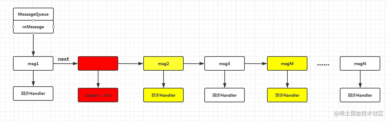 如上图所示,在消息队列中有同步消息和异步消息,以及同步屏障(红色部分)。有了同步屏障的存在,msg2 和 msgM 两个异步消息可以被优先执行,而后面的 msg3等 同步消息则不会被处理。那同步消息怎么被处理呢? 那就需要先移除屏障,即调用 removeSyncBarrier()