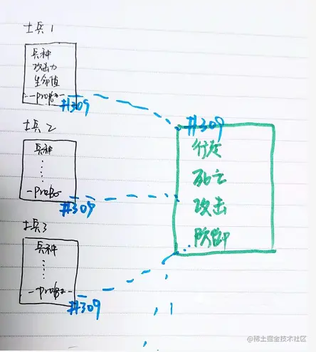 把100个士兵对象的共有属性放到原型里。那我们可以尝试把每个士兵的共同属性(行走、死亡、防御、攻击)给 士兵这个对象的原型,那么当我们创建士兵1,士兵2,士兵3,士兵4……的时候,每一个士兵都有一个