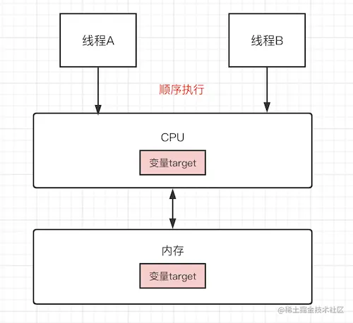 在单核心时代,所有的线程都是交给一个CPU串行执行,因此不论有多少线程都是排队执行,也就不会形成线程A与B同时竞争target变量的竞争状态,如图一。