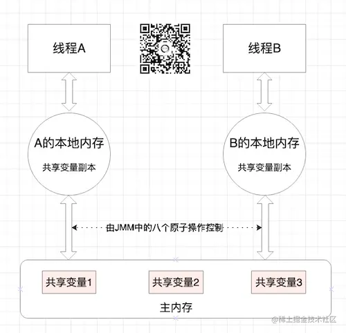 这个简单,如果仅仅是解决可见性,那就Volatile关键字用起来(也不是万能的,慎重考虑),它会将共享变量数据从线程工作内存刷新到主存中,而这个关键字的实现基础是Java规范的内存模型,注意,这里要和JVM内存模型区分开,两者是不一样的东西。那么Java内存模型又是什么样的,为啥设计这个内存模型,有哪些好处?下篇详细解释!本文就先放一张简单的图:
