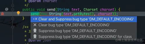 一共四个选项,两个条件:clear和suppress。前者是清楚这个错误,但只是清除单次测试结果,不影响再次扫描。后者是添加注解uppressFBWarnings("DM_DEFAULT_ENCODING"),引号内容是错误类型,具体解释在SpotBugs面板的右侧,内容跟官网文档一致。