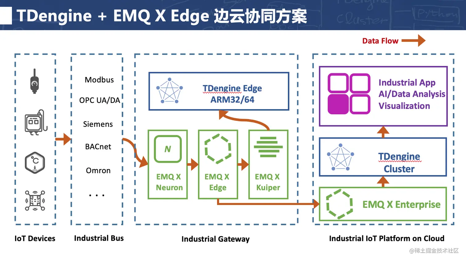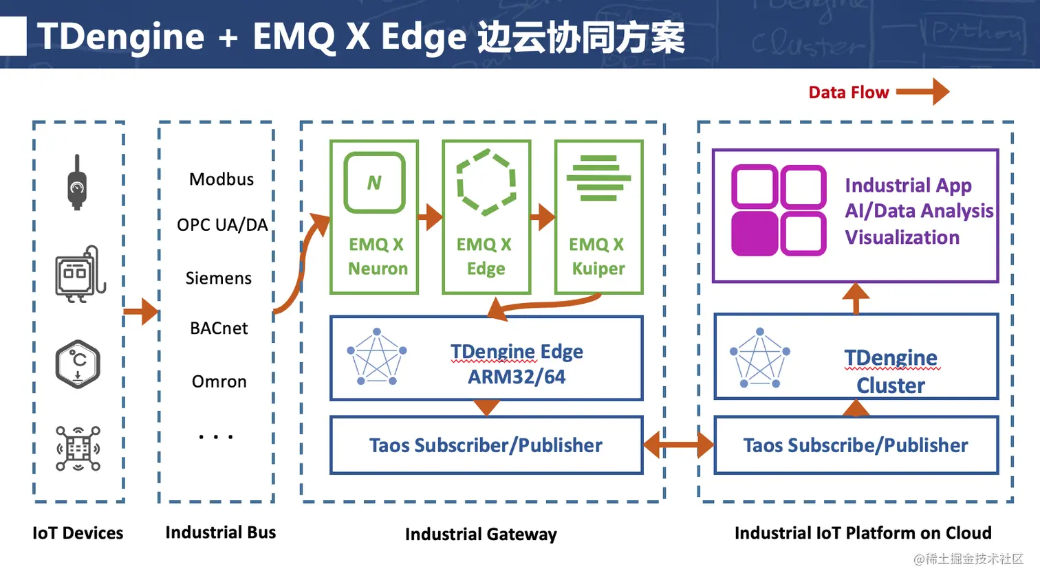 基于TDengine在边缘侧的存储优势以及边云协同的整体思路,涛思数据和EMQ也联合做了一个边缘侧的解决方案。简单来说,边缘侧网关中部署EMQ X Neuron、EMQ X Edge和EMQ X Kuiper以及TDengine,将设备采集的流式数据通过Neuron做协议解析转换成MQTT消息,然后发布Edge(边缘侧MQTT Broker),再通过Kuiper存入在边缘部署的 TDengine 中。这样在边缘端运行的应用即可从 TDengine 中获取和处理数据,做实时显示和报警。EMQ 在边缘端运行的 Edge Manager 提供了一个管理控制台,可以很方便地实现软件配置和管理其他三个组件。点击「这里」,详细了解该方案的配置方法。这种方案相当于把协调的工作交给了EMQ。