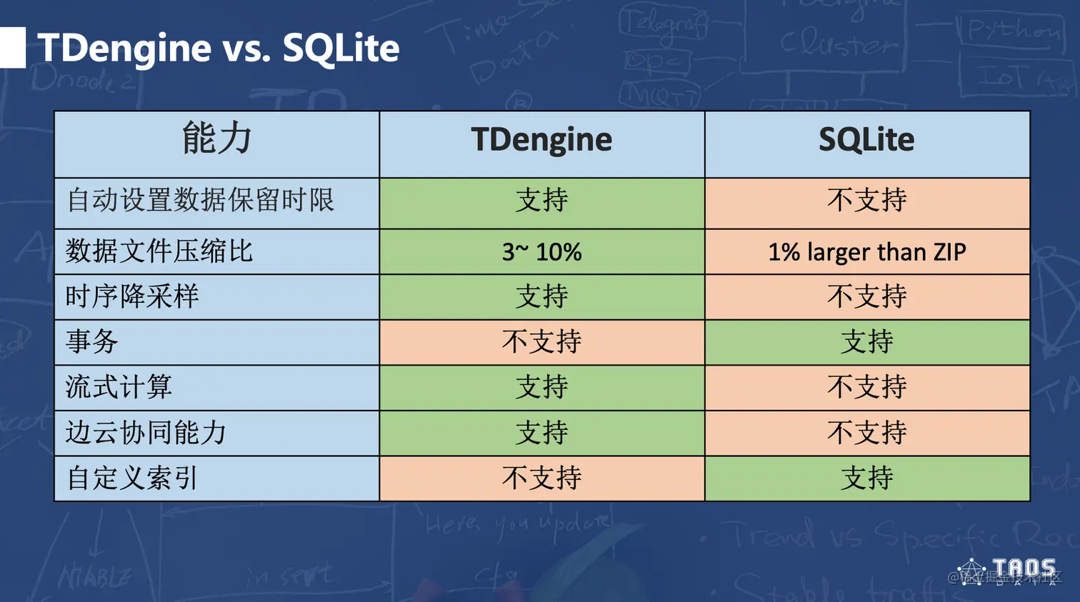 两者相对比一下,SQLite在Linux上的安装包为1.9MB,TDengine为2.7MB。两者都是把轻量化做到极致。由于TDengine是专门针对时序结构化数据的一种方案,不支持事务和复杂的表关系处理,但会提供时序数据的时间索引、实时流计算、列式存储及更好的压缩比、按照时间的降采样聚合能力、数据保存时限等。从这个角度来说,TDengine要比SQLite更贴近边缘侧生产环境中对时序数据的处理需求。TDengine边缘侧版本也可以做到云端的产品无缝对接,如果网络不畅,TDengine可以实现数据自动缓存,联网后自动续传,实现边云协同的能力。下面用一张图来简单总结下TDengine和SQLite的区别。