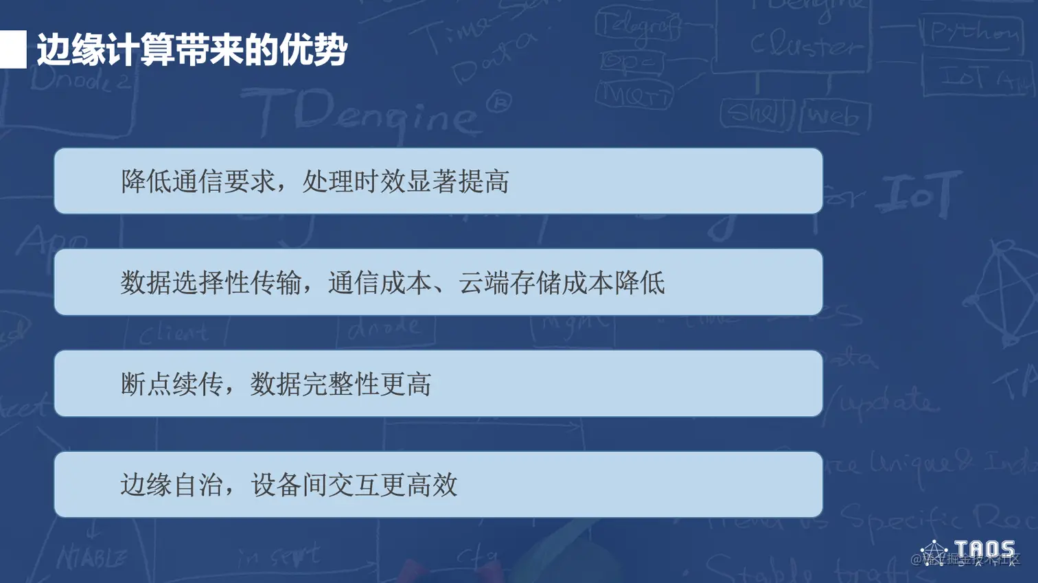 解决这个问题的一个很好的思路就是边缘计算,即把一部分的存储和计算的能力下沉到边缘侧(即设备侧),终端设备较独立地进行数据存储、计算、决策和应用。这样边缘侧就变得更智能,对云端依赖更小,数据处理的时效性也更高,且不再受网络影响。