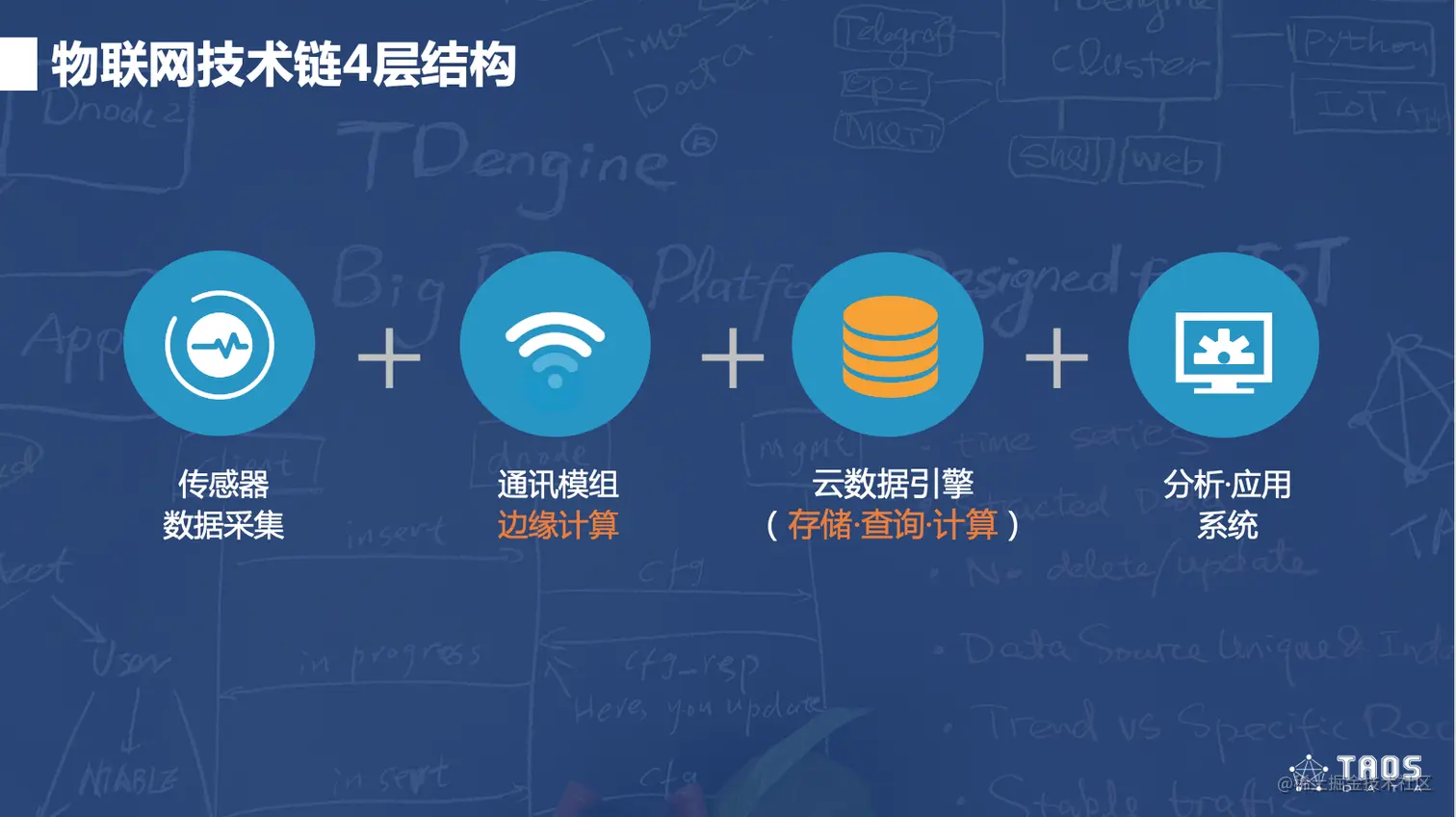 整个物联网技术链有4层结构:通过传感器采集设备的状态数据 -> 通过通讯模组将数据发往云端 -> 在云端进行存储、查询和计算 -> 最后接入分析及应用系统。