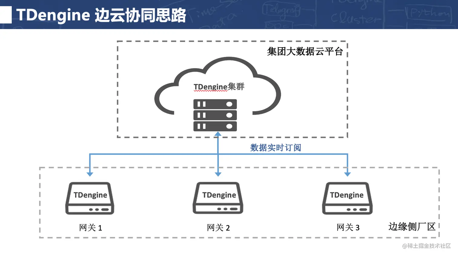 但也可能有的用户已经在云端用了TDengine的集群,现在也有一些工业设备,想直接通过TDengine Cluster客户端直接去访问边缘侧的TDengine。这种也可以通过TDengine的数据订阅的模块直接实现,即云端的应用调用数据订阅模块创建一系列的订阅任务,直接去实时拉取边缘侧TDengine中的最新增量数据。这种方案相当于把协同的工作又交给了TDengine,当然这里要保证网络是畅通的。