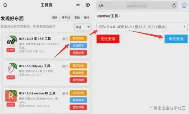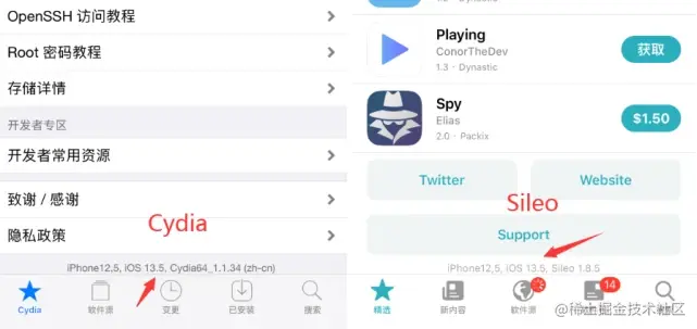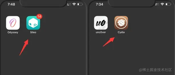 暂不提 checkra1n,只是单独说一下手机版在线越狱的这二款工具,先说一下这二款越狱工具区别,Odyssey 越狱后会出现 sileo 越狱商店,而 unc0ver 越狱后会出现 Cydia 商店。