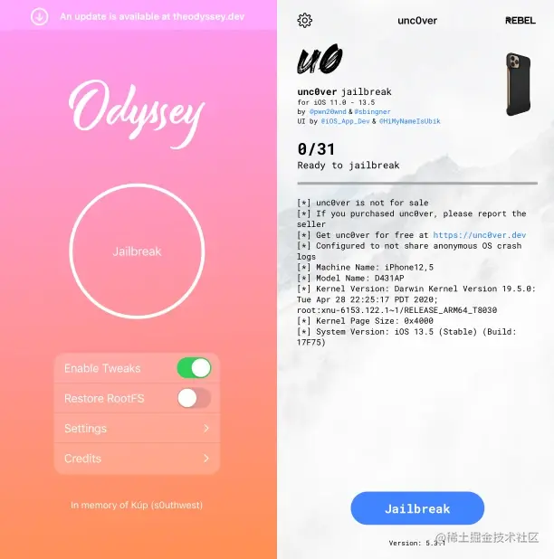上述说越狱工具区分,现在说越狱开发者效率,Odyssey 越狱是由 CoolStar 作者开发,他进度较慢,还多次吊胃口,而 unc0ver 越狱是由 Pwn20wnd 作者开发,效率极快,也是很多用户较为看重。