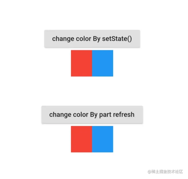 我们可以看到,在‘下方’代码区域中,下方按钮如果想交换其下方两个色块的颜色,只需要直接调用它的switchColor(),同时不会触发无关widget和页面的build方法。