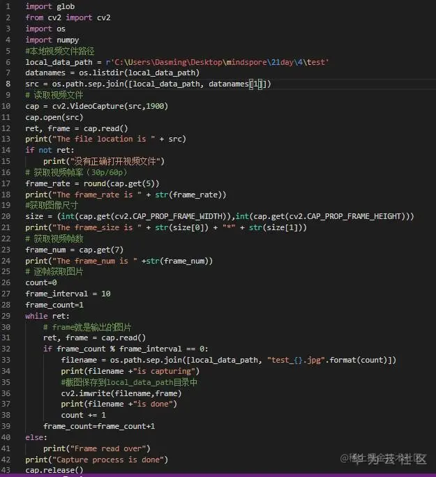 2、对视频进行切分为图片,格式为.jpg。根据本课提供的OpenCV代码,在本地测试成功后,放到ModelArts上调试却不成功,多次调试无果。