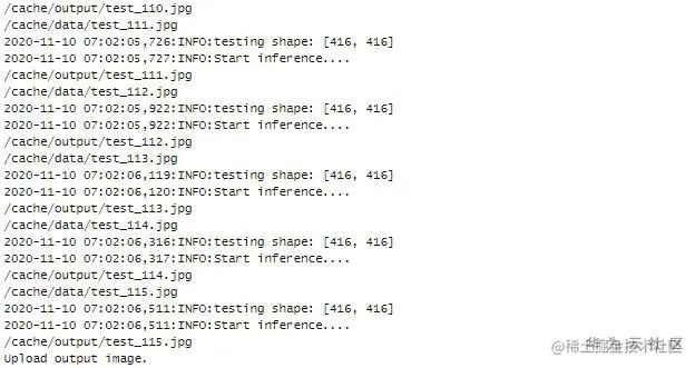 2.5 将Yolov3代码上传OBS桶Yolov3代码目录,并设置启动predict.py;在输出图片遍历的打印信息后,图片的检测工作就完成了,并输出到设置的OBS输出目录中。ModelArts检测日志见下图: