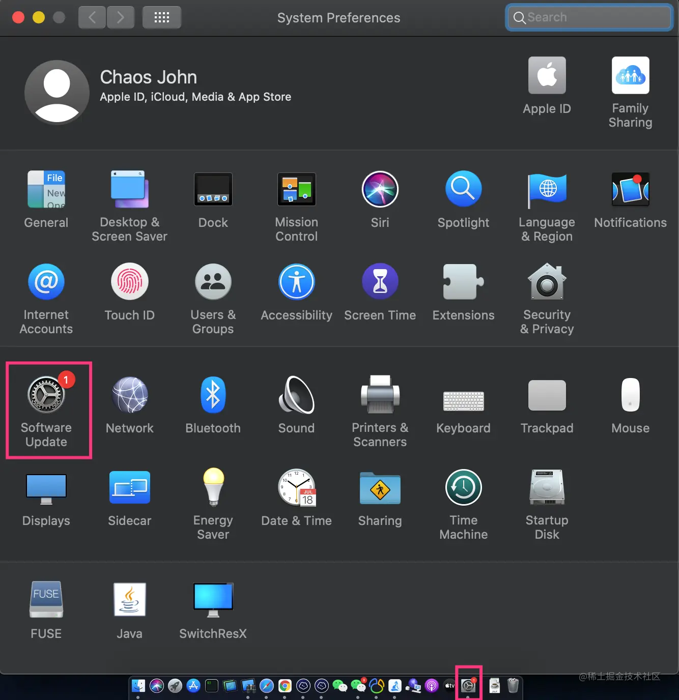 - 系统左上角苹果标🍎,点击下拉菜单,在 系统偏好设置(System Preferences) 处提醒有更新