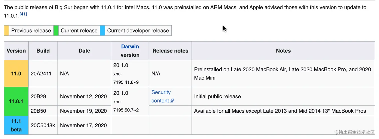 近日来,苹果电脑的操作系统 macOS Catalina 接近了生命周期的尾声,新的操作系统 Big Sur 于2020年11月12日已经发布(很有意思的是正式版的首个版本号为11.0.1,而11.0.0并未对外发布,只预装在Apple M1的三台ARM新机上,详见下图,来源于维基百科)