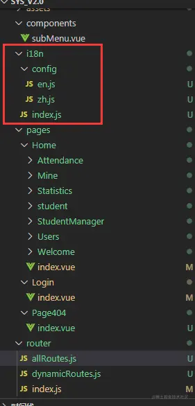 我们首先在项目中src目录下建立一个叫做i18n的文件夹,路径为/src/i18n 当前的例子只提供两种语言(多了写的累-_-||),分别是en英文和zh中文,格式如下建立就可以了,我们秉承着高内聚低耦合的思路,所以把原本i18n实例中messages中的属性进行模块化拆分为两个文件,如下图,都放置在config文件夹中