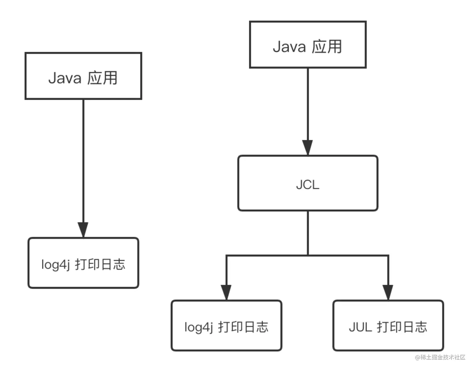 它与其它的日志工具有所不同,使用他时必须依赖其它的日志包才能进行打印,类似于设计模式中的工厂模式,如图我们可以看到,当使用log4j的时候是直接可以打印日志,JCL并不进行打印,而是做了一个代理功能,只要你引入log4j的包就会使用log4j进行打印,没有log4j包就会使JUL进行打印日志。
