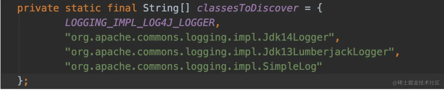 我们接着看看 classesToDiscover 数组到底是什么,如图所示:是一个容纳长度为4 的字符串,这四个字符串分别指向了 log4j, Jdk14Logger, Jdk13LumberjackLogger,SimpleLog 四个日志工具。接着点进 createLogFromClass() 函数看看做了什么事情。