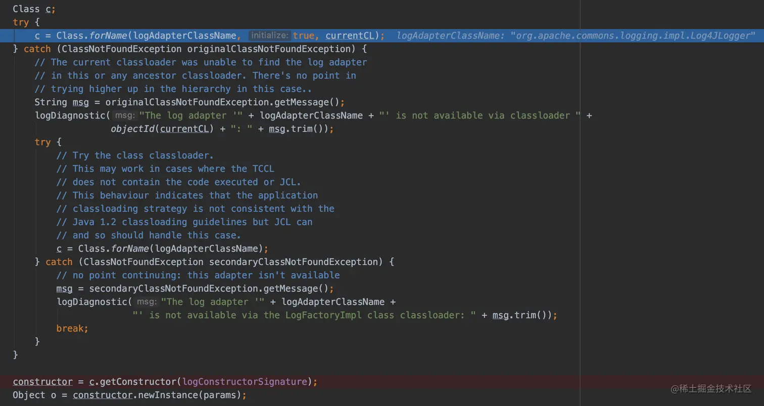 由于这个函数过长,我们就将重要的截图下来看到,其实它是根据循环得到的字符串,通过反射实例化了日志对象,从零开始循环,没有通过反射得到该对象时,说明没有引入这个包,所以返回null。