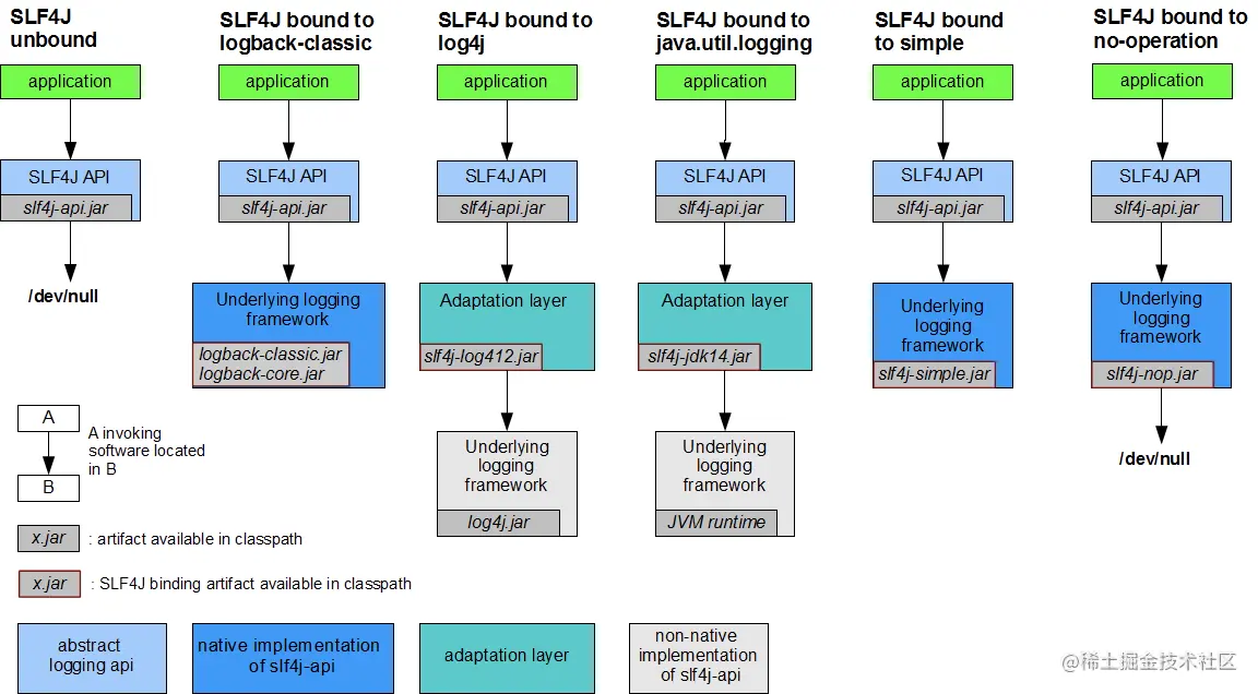 SLF4J 可作为各种日志记录框架(例如java.util.logging,logback,log4j)的简单外观或抽象,允许最终用户在部署时插入所需的日志记录框架。