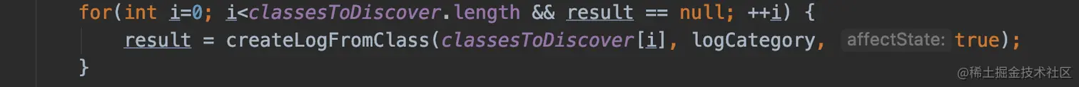 首先在 LogFactory 的实现类的 LogFactoryImpl 中的 discoverLogImplementation()方法 中有个以 classesToDiscover 数组的长度进行for循环,如图: