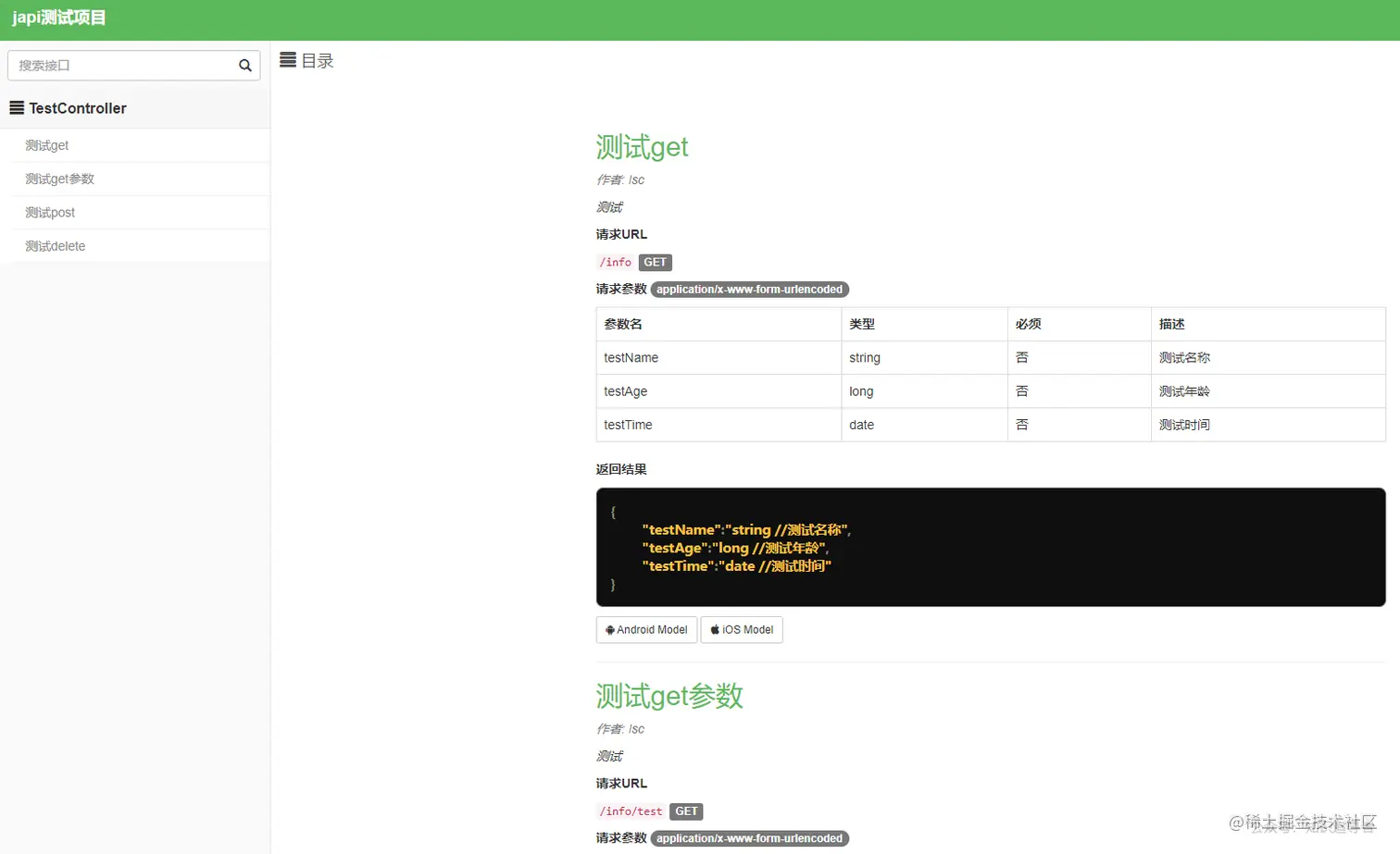 JApiDocs 是一个符合 Java 编程习惯的 Api 文档生成工具。最大程度地利用 Java 的语法特性,你只管用心设计好接口,添加必要的注释,JApiDocs 会帮你导出一份漂亮的 Html 文档,并生成相关的 Java 和 Object-C 相关数据模型代码,从此,Android 和 IOS 的同学可以少敲很多代码了,你也不需要费力维护接口文档的变化,只需要维护好你的代码就可以了。