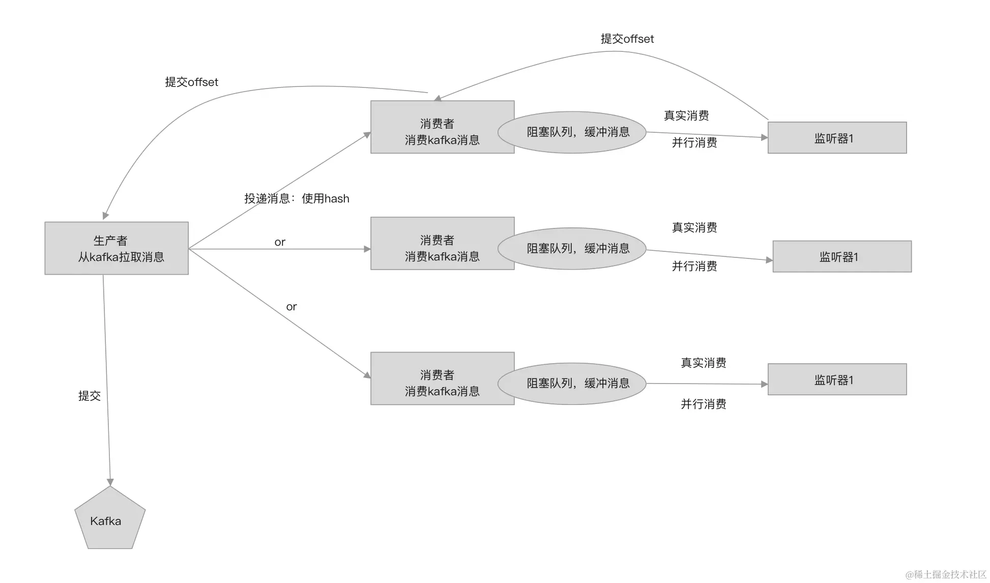 一种比较折中的方法是,在官方DEMO的基础上,将单一生产者对应一个消费者,改为单一生产者对应多个消费者,并且消费者不再负责定时提交offset(消费偏移量)。