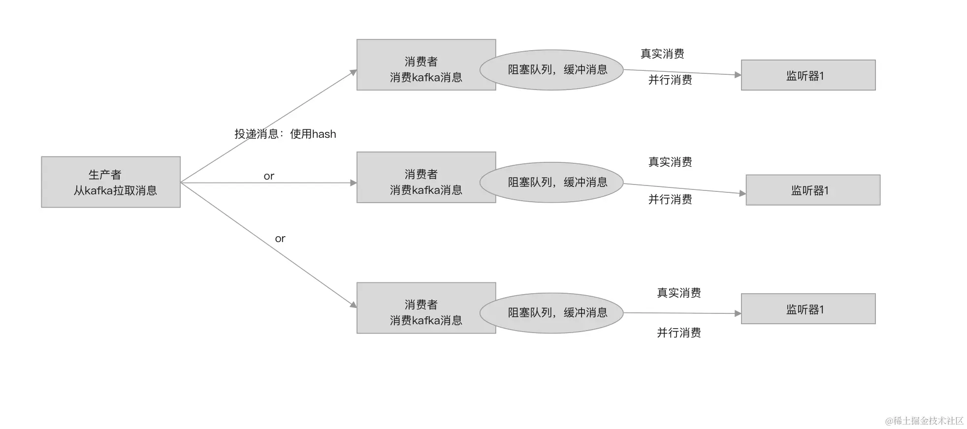生产-消费模型中的消费者并不负责真正的消费消息,而是将消息交给多个监听器去消费。