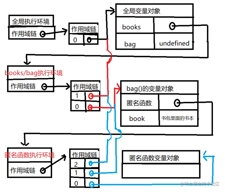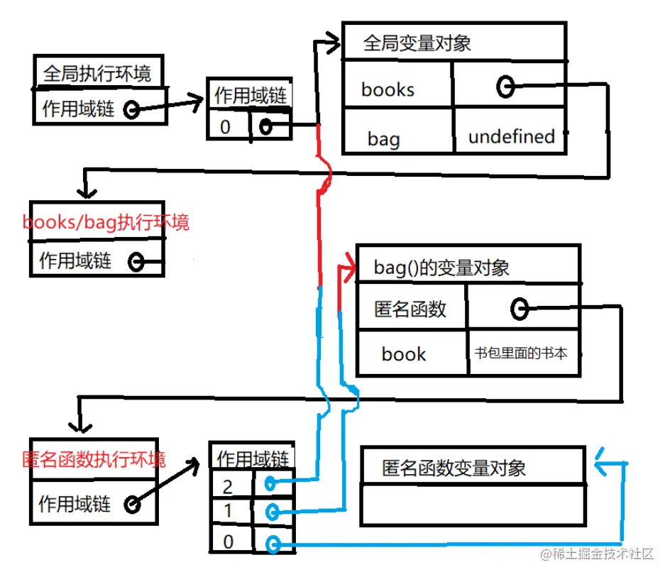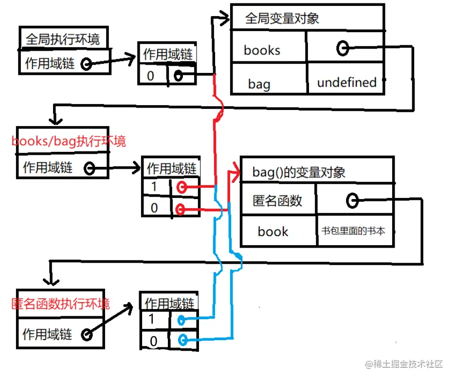执行完books()函数后,books/bag函数的作用域链会被销毁,books/bag函数的变量对象在存在匿名函数作用域链的指引情况下,而没有被销毁(即匿名函数可以访问bag函数作用域中变量,所以该匿名函数是闭包)