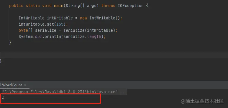为了检查IntWritable的序列化形式,我们在java.io.DataOutoytStream(Java.io.DataOutput的一个实现)中加入了一个帮助函数来封装java.io.ByteArrayOutputStream,以便在序列化流中捕捉字节: