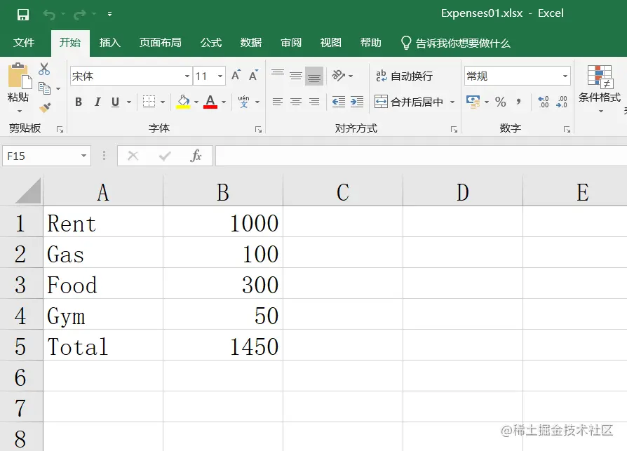 运行程序,看到生成了 Expenses01.xlsx 文件,打开看到以下内容: