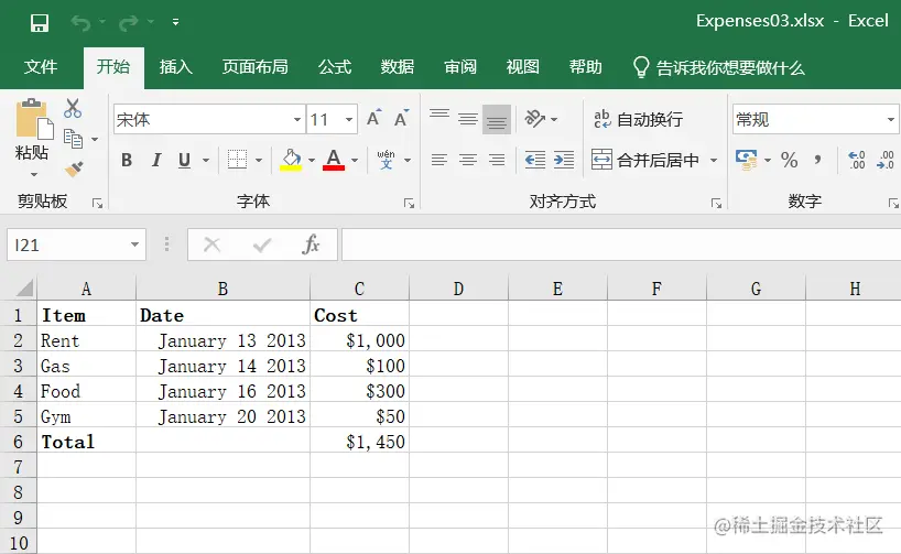 运行程序,看到生成了 Expenses03.xlsx 文件,打开看到以下内容: