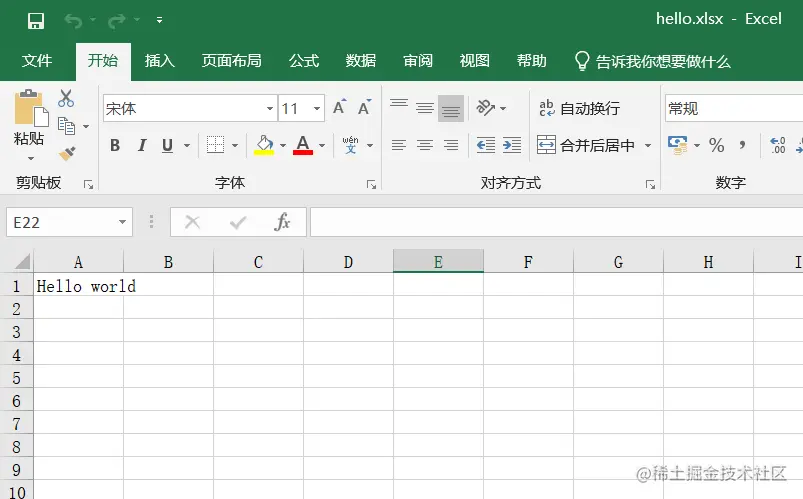 打开 hello.xlsx 文件,发现内容如下,表示安装成功: