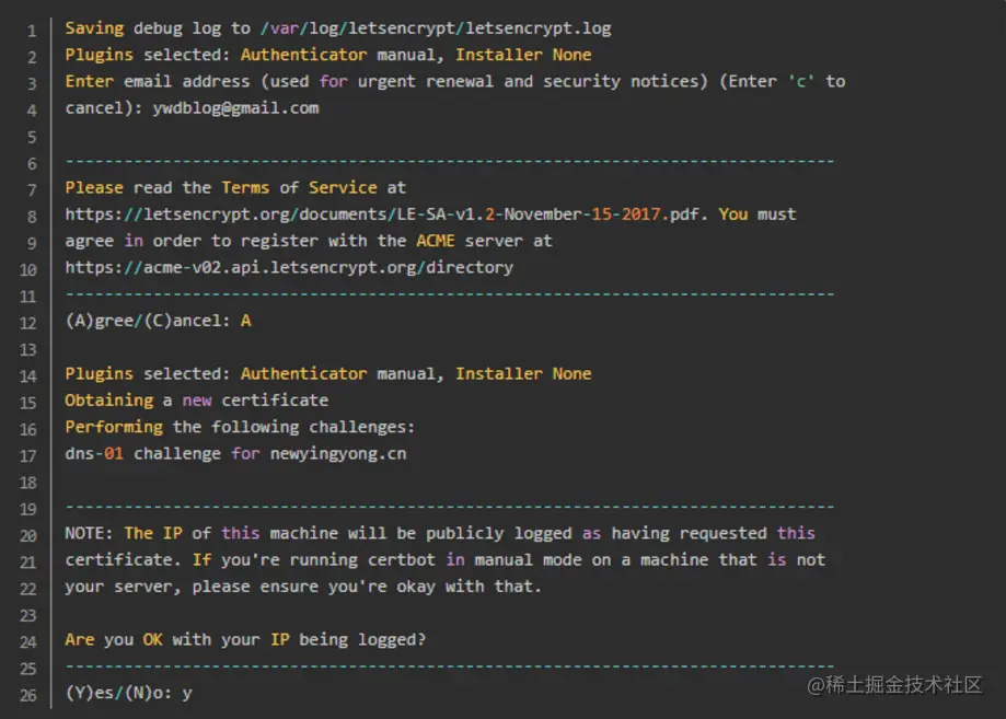 - --manual 表示手动安装插件,Certbot 有很多插件,不同的插件都可以申请证书,用户可以根据需要自行选择
