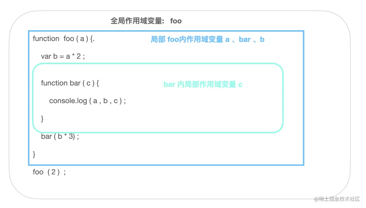 如上图, 每个变量的作用域气泡由其对应的作用域块代码写在哪里决定, 它们是逐级包含的. 代码中bar的气泡被完全包含在foo所创建的气泡中, 唯一的原因是那里就是我们希望定义函数bar的位置。
