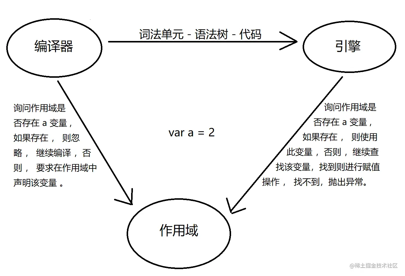 变量的赋值操作会执行两个动作, 首先编译器会在当前作用域中声明一个变量( 如果之前没有声明过),然后在运行时引擎会在作用域中查找该变量, 如果能够找到就会对它赋值。