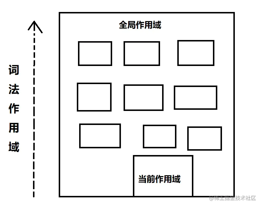 词法作用域查找只会查找一级标识符, 比如a、b和c。如果代码中引用了foo.bar.baz,词法作用域查找只会试图查找foo标识符, 找到这个变量后, 对象属性访问规则会分别接管对bar和baz属性的访问。