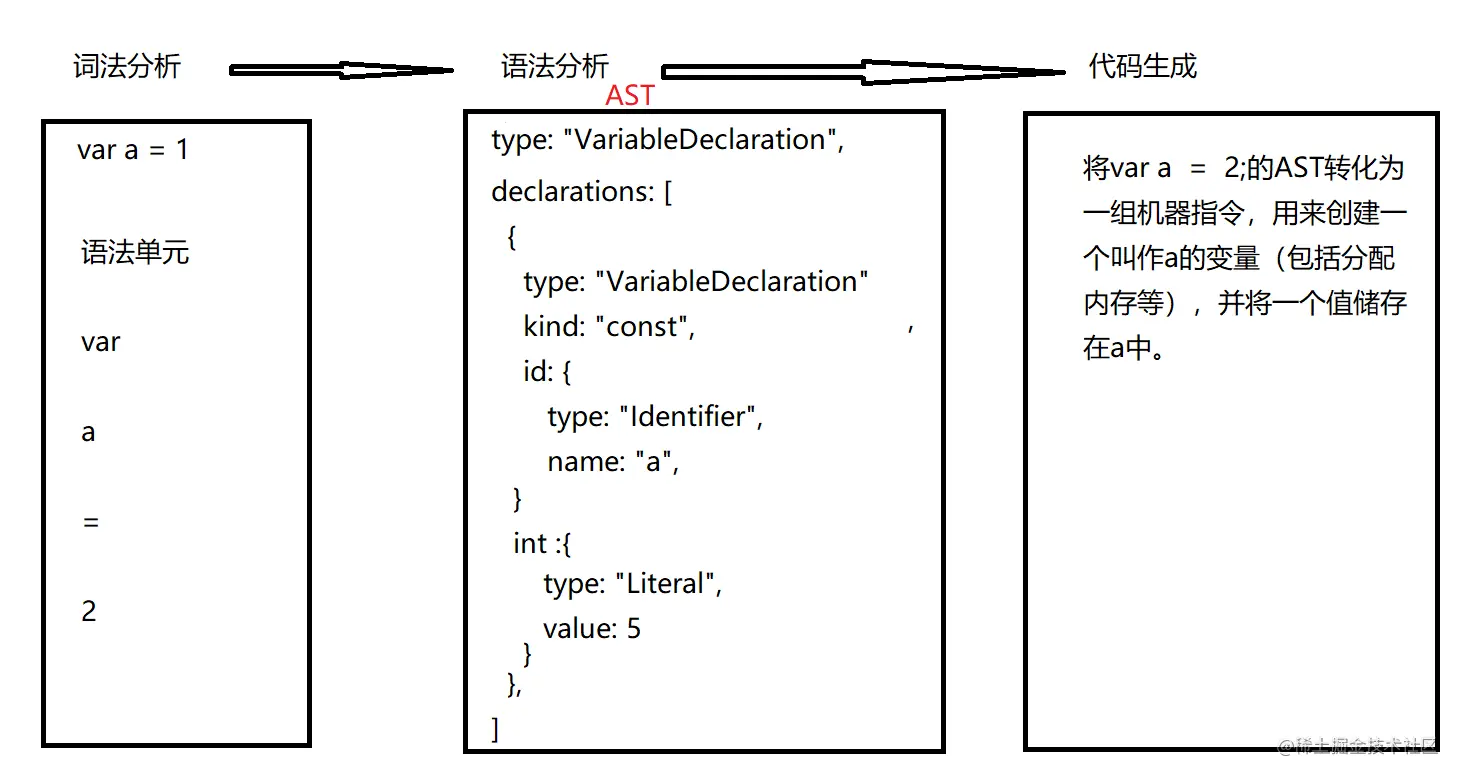 - 代码生成: 将AST转换为可执行代码的过程称被称为代码生成 .