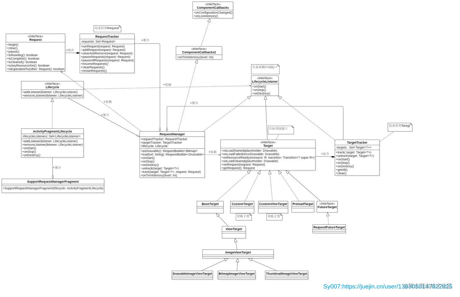 LifecycleListener接口类中的onStart(),onStop(),onDestroy()。根据UML可知,RequestManager实现了LifecycleListener,所以RequestManager可以根据生命周期变化来控制请求的暂停,恢复以及取消。 -