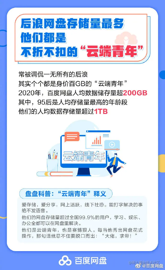 2020 年百度网盘用户数据存储总量已突破 1000 亿 GB,报告显示,2020 年百度网盘人均数据存储量超过 200GB,其中 95 后平均数据存储量超过 1TB。