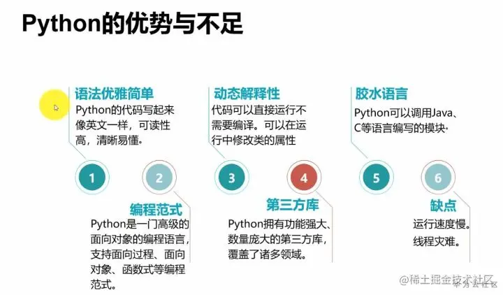 我们知道想掌握一门语言,首先得先了解其优势和不足。Python第一个优势在于语法优雅简单,Python写起来就像写英文一样,可读性非常高,清晰易懂。比较容易理解。第二个优势是编程范式,它支持很多编程范式,面向过程、面向对象,它还支持函数式编程。第三点优势是Python的一个动态解释性, Python代码是不需要编译的,可以直接由Python解释器来进行运行,也可以在运行中修改类的属性,相较于Java或者说C语言的代码来说,这是一个很大的优势。第四点优势,第三方库。Python拥有功能强大并且数量庞大的第三方库。迄今为止,它的第三方库已经超过18万个,涉及到各行各业、多个领域,非常方便。Python有一个代号叫做胶水语言,这也是它的第五点优势。这个代号的来由是因为Python可以去调用Java以及C语言编写好的模块。