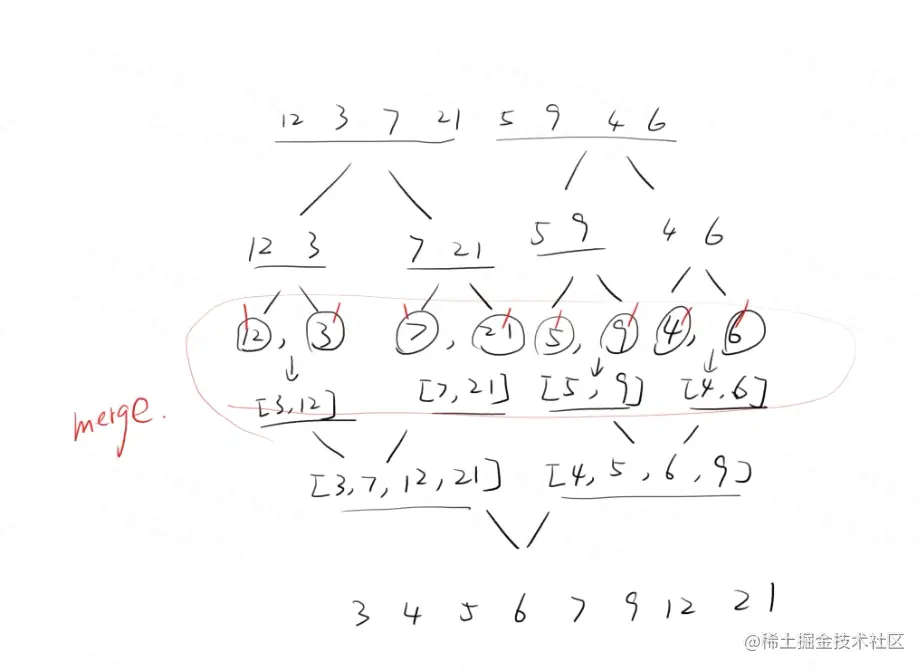 let mergeSort=arr=>{ let k=arr.length; if(k===1){return arr} let left=arr.slice(0,Math.floor(k/2)) let right=arr.slice(Math.floor(k/2)) return merge(mergeSort(left),mergeSort(right))}let merge=(a,b)=>{ if(a.length===0) return b if(b.length===0) return a let res=a[0]>b[0]?[b[0],...merge(a,b.slice(1))]:[a[0],...merge(a.slice(1),b)] return res}let arr=[3,1,2,5,2]console.log(mergeSort(arr));