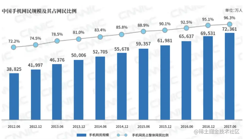 根据第40次中国互联网络发展状况统计报告,手机网民规模已经由12年的72%提升到17年的96% ,移动互联网进入存量市场。