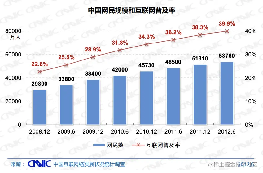 根据第30次《中国互联网络发展状况统计报告》,截止12年6月,我国互联网普及率达到39.9% 。