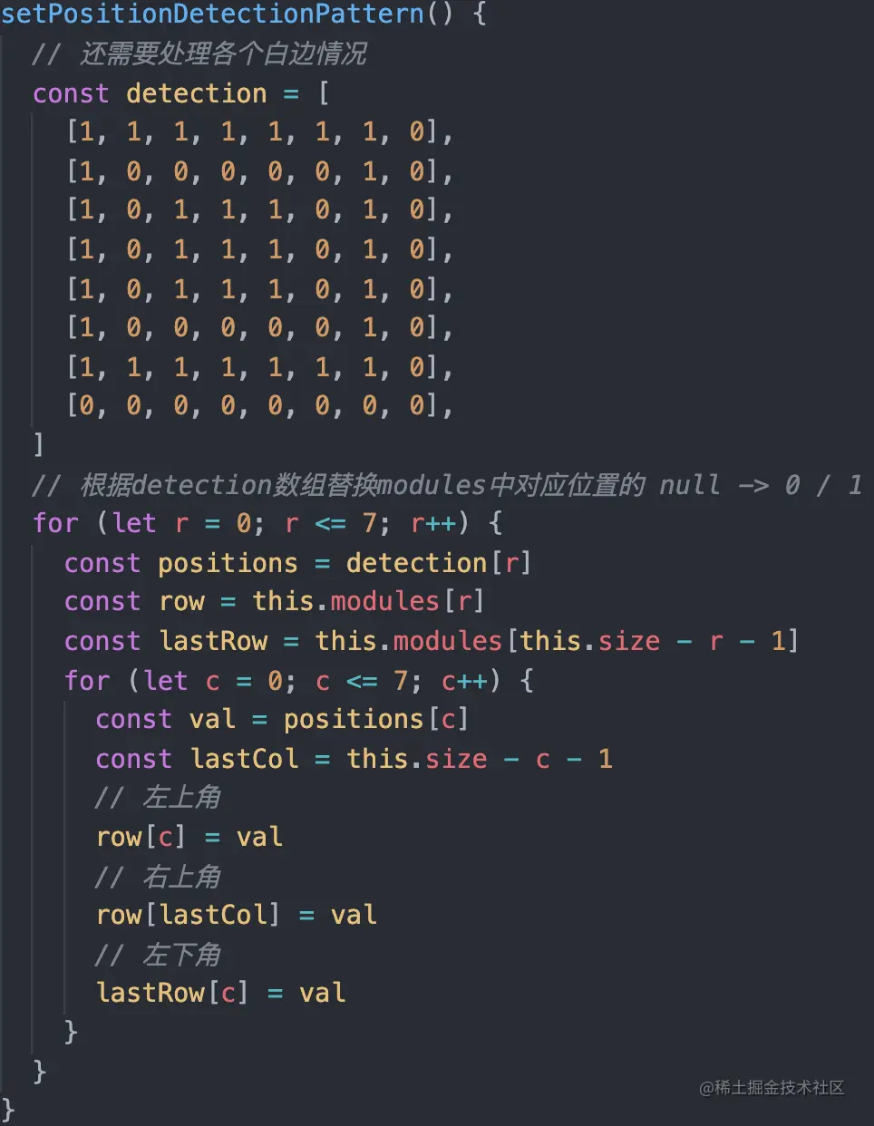 在实现时,千万不能忘记了定位图片需要被白色块包裹,也就是理论准备中二维图中的分割器(Separators fro Position Detection Patterns),此处又踩了个坑。实现方式也相对源码取巧,生成一个二维数组标识方块,如下图,然后遍历该二维数组,设置对应modules属性中位置: