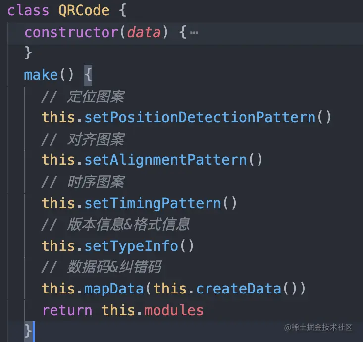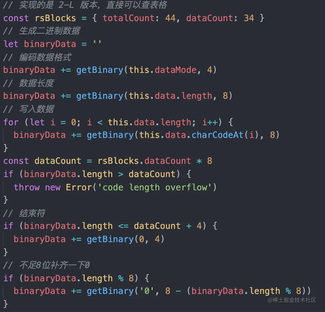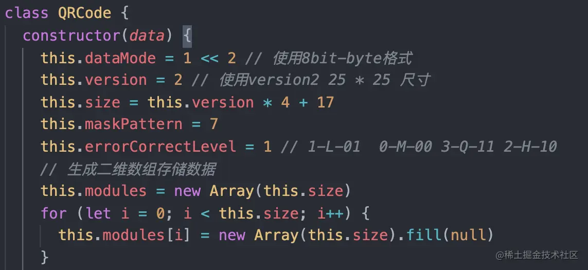 因为二维码有较多版本,不同版本的尺寸不一样,本想实现 version1 版本,但过于简单,连个对齐图案都没有,故就实现了 version2版本,使用的字节编码(Byte Mode)模式,不同模式生成二维码对应的二进制位数不一样。在初始化时就设定好版本,同时创建一个modules属性存储二维码图案信息,使用 1 标识黑块,0 标识白块,null标识还未被处理,吐血的经验,图案信息需要三个状态,一开始实现我都初始化为 0,后面处理数据码和纠错码时,死活会有问题。