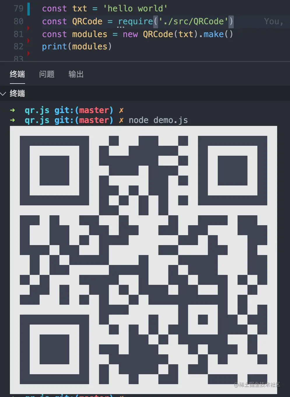 手撸代码前,因为是本地开发,为了方便预览、调试,期望本地可以直接在 terminal 中展示二维码,故直接先"借鉴" qrcode-terminal的做法,先完成了一个terminal预览二维码的工具,具体可以参考 Terminal展示二维码