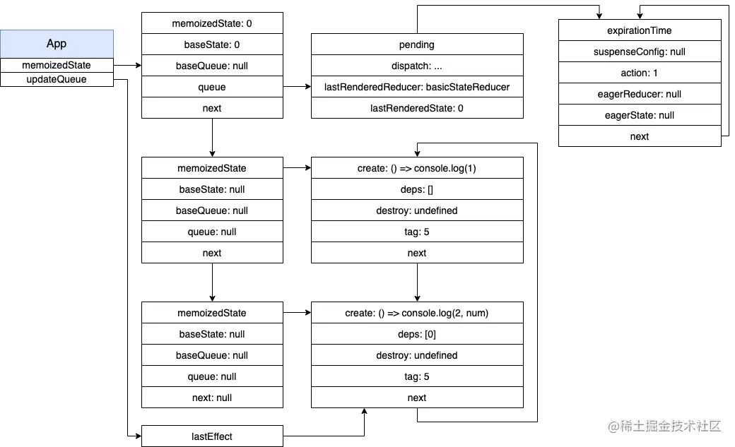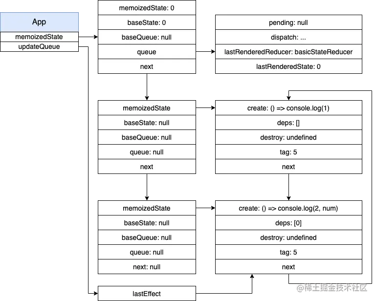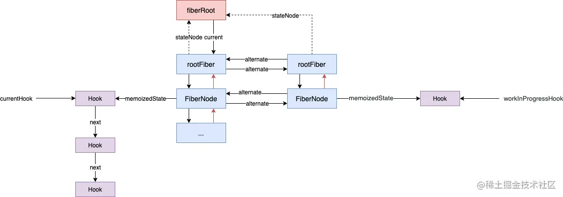 如下图所示,hooks 之间会形成一个链表并保持在 FiberNode 的 memoizedState 属性之上,链表通过游标 currentHook 或 workInProgressHook 来进行遍历。我们知道 React 更新的时候会存在两棵 Fiber 树,一颗是上次已经构建好的 Fiber 树,一颗是正在构建的 Fiber 树,而 currentHook 和 workInProgressHook 分别是为这两棵树工作的。