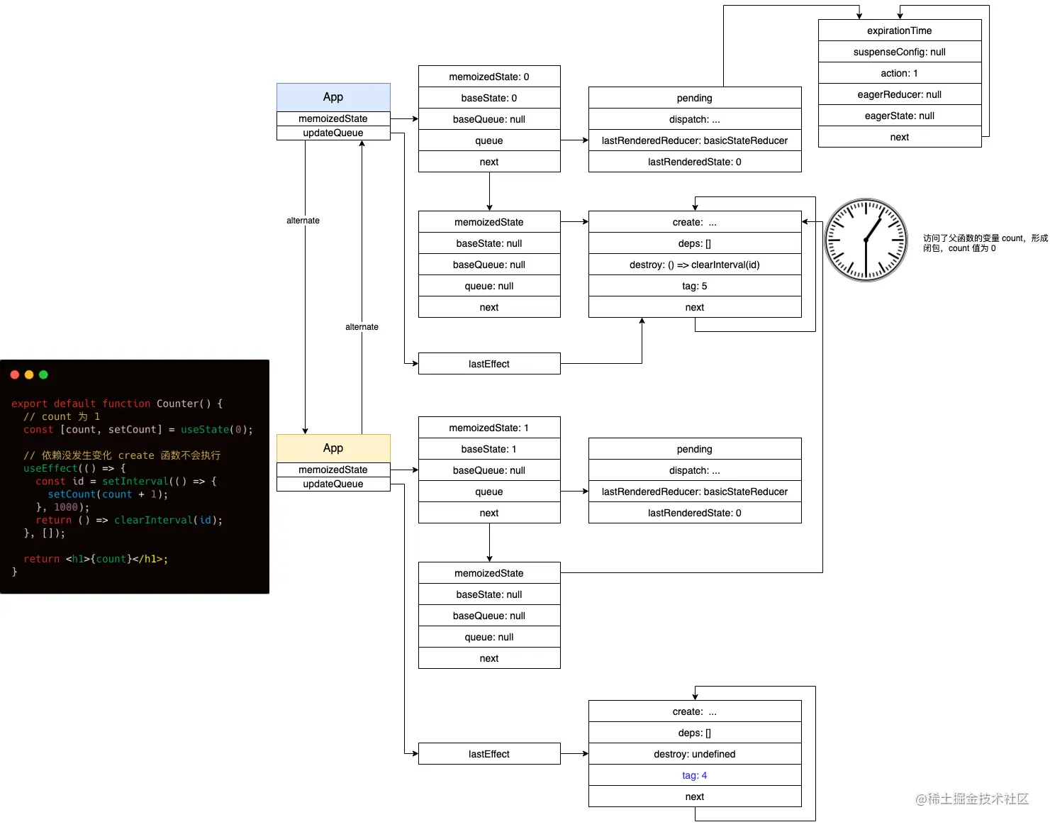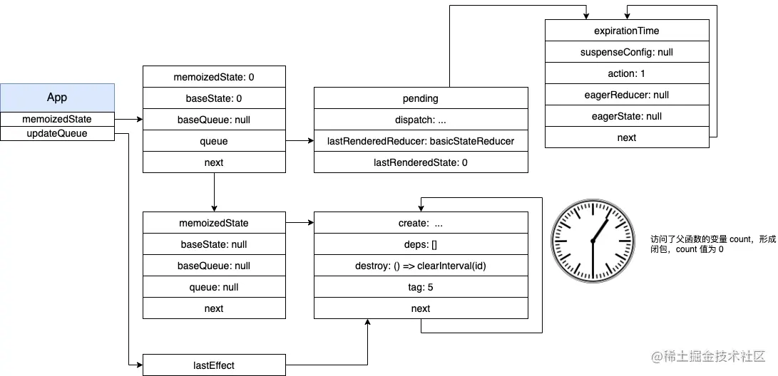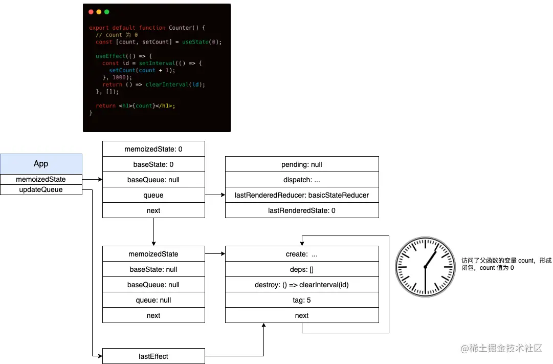 useEffect 的 create 方法时,会生成一个定时器,该定时器中访问了父函数的变量 count,形成闭包,count 值为 0。