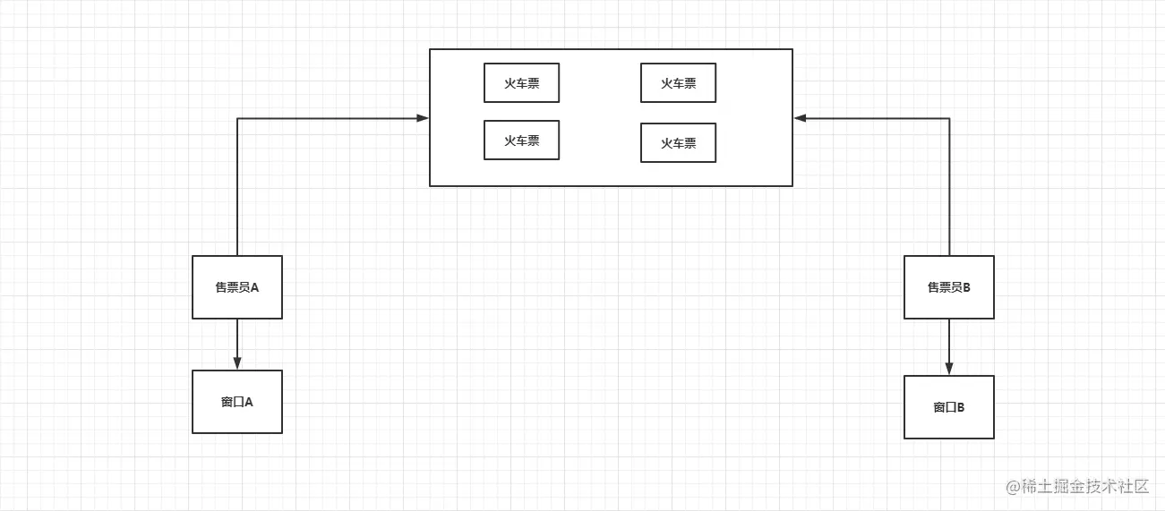 先说一下,不同的操作系统调度机制不同,假如你运行和我一样的代码,跑不出和一样的结果,也在情理之中。也许你的是出现a和b都卖了1998这张票,也许是其他的。一般来说我们都会认为这是不正常的,因为我们认为两个线程应该是协作干活,不应该出现两个线程同时卖一张票的结果,为什么我们会有这种想当然呢?我们先不落实的具体的计算机上,我们先将这个卖票放在现实场景来分析,同样做一个比较粗糙的假定,还没有伟大的程序员们为他们做售票系统,是两个卖票员在一个房间里两个售票口,有一张桌子上面放了一堆票,有人来卖票员去桌子上看,还有没有票,有的话,将票递给乘客。