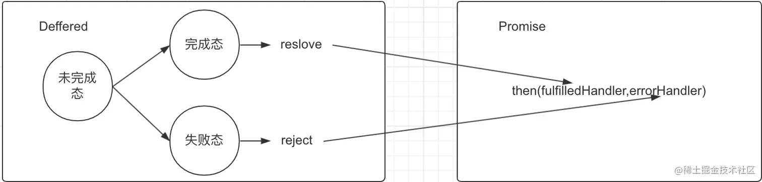 Deferred主要用于内部,用于维护异步模型的状态;Promise则作用于外部,通过then()方法暴露给外部以添加自定义逻辑